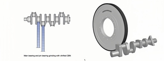 This type of grinding wheel is mainly used for high-efficiency and powerful grinding of the journal, connecting rod diameter and flange of the engine crankshaft. The grinding wheel linear speed is generally 80m/s-150m/s. It can be matched with imported CNC high-precision C8N special crankshaft grinders, such as CBN grinding wheel special crankshaft grinders produced by Naxos, Junker, Landis, etc.